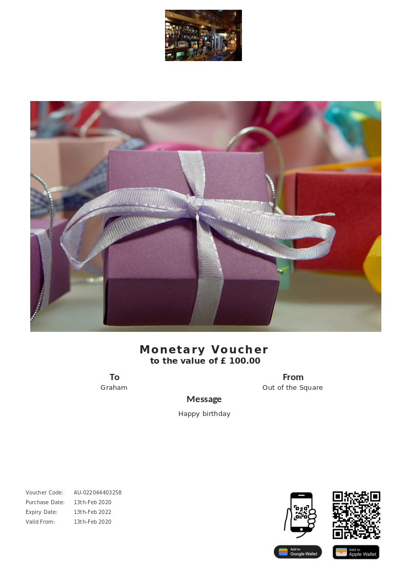 1. You must present the gift voucher in the establishment upon arrival. 2. Gift Vouchers cannot be extended, are non-transferable and non-refundable. 3. When making a reservation please notify the business of your intent to use a voucher. 4.Your voucher code is unique to you, it is your responsibility to not disclose this code to others. 5. All bookings are subject to availability and change. 6. Gift Vouchers are valid from the date of purchase until the expiry date.